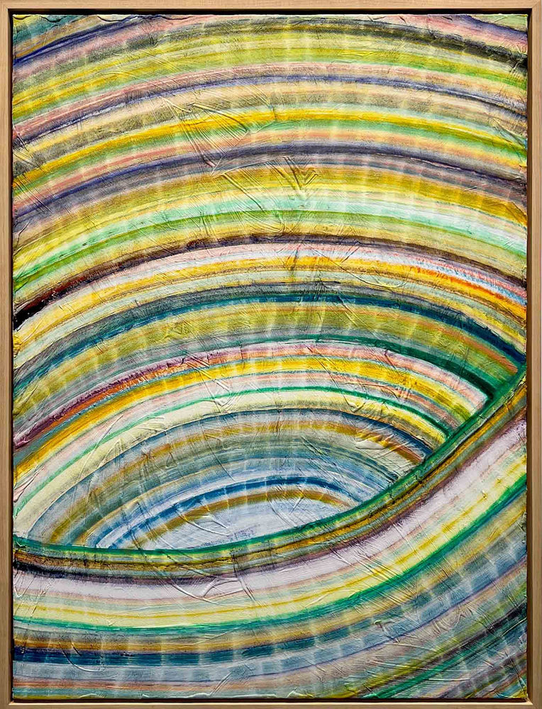 Based on intuitive movement, my paintings unfold in rhythmic curving patterns bringing a sense of joy and vitality to the spaces they inhabit. With 'Earth Gem' colors meld into one...